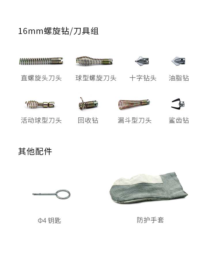 16mm刀頭套裝(活動球型刀頭、直螺旋頭刀頭、球型螺旋刀頭、油脂鉆、十字鉆頭、回收鉆、漏斗型刀頭、鯊齒鉆/各1個)、防護手套1雙、鑰匙1個、軟軸放置框1個