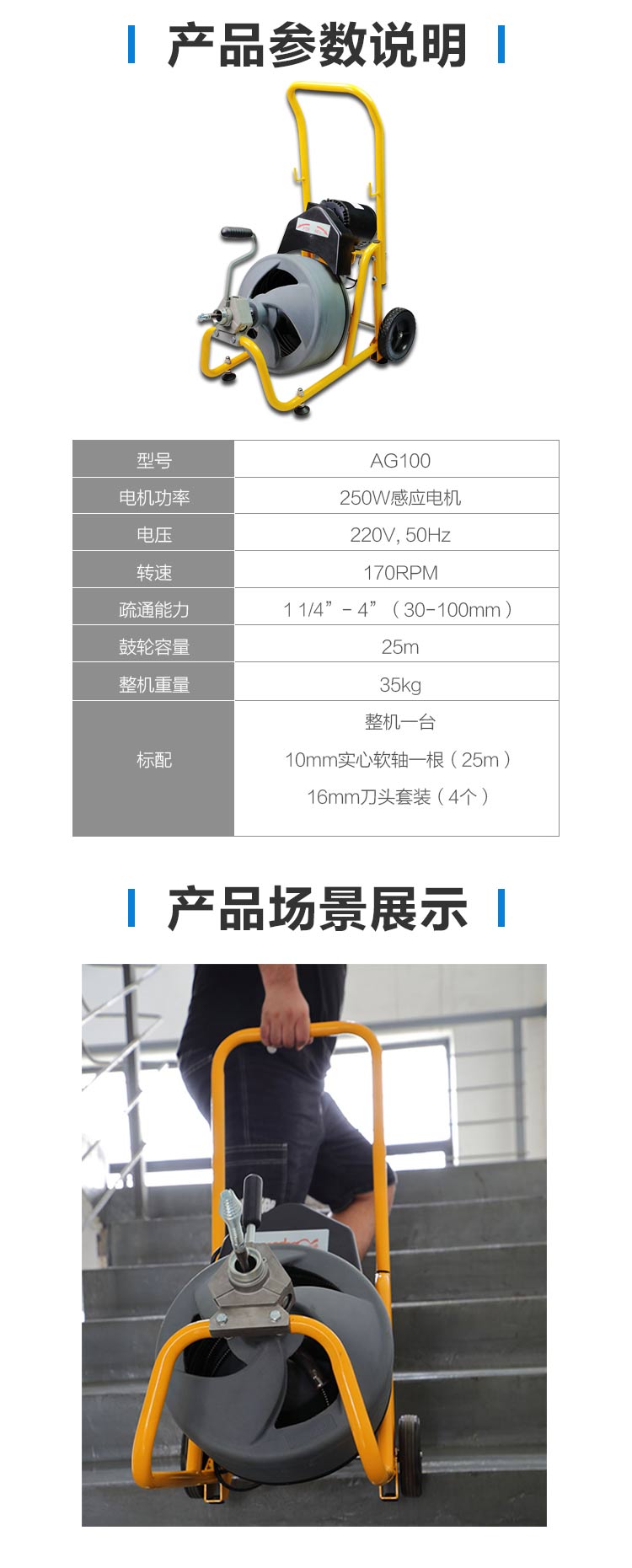 • 產(chǎn)品描述:虎王AG100高效鼓式疏通機(jī)下水管道疏通神器家用堵塞清理工具